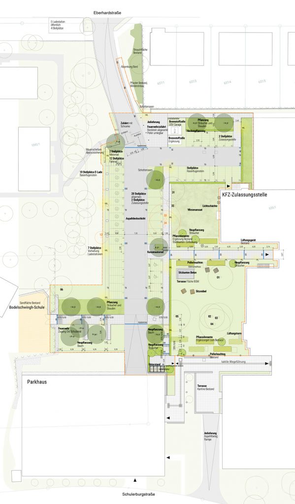 Neue Wegeverbindungen und Heckenpflanzen geben die Laufrichtung in die jeweiligen Gebäude vor. Pausenflächen für Mitarbeitende werden unter dem schönen Baumbestand angegliedert. Die Aufenthaltsqualität wird durch die Gestaltung von Ruhezonen und Sitzgelegenheiten erhöht. Die Sitzelemente können nach Wunsch auch für sportliche Treffen nach der Arbeit aktiviert werden. Die starke Böschungskante zur angrenzenden Schule wird ebenfalls für den Aufenthalt in den Pausen mit Sitzstufen angeboten.